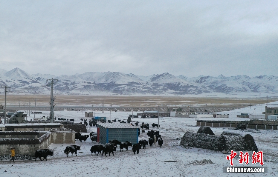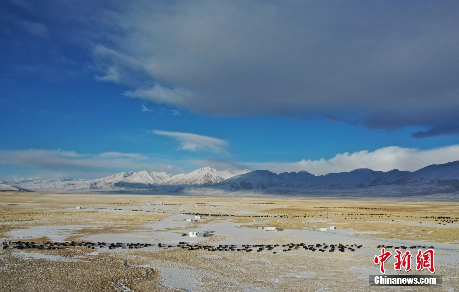 1月27日,當(dāng)雄縣龍仁鄉(xiāng)烏達(dá)村牧民在雪中放牧。當(dāng)雄縣位于西藏自治區(qū)拉薩市北部,距拉薩市區(qū)170公里?!爱?dāng)雄”,藏語意為“天選牧場(chǎng)”,平均海拔約4200米,草場(chǎng)廣闊,土地肥沃。(無人機(jī)照片) 中新社記者 貢嘎來松 攝