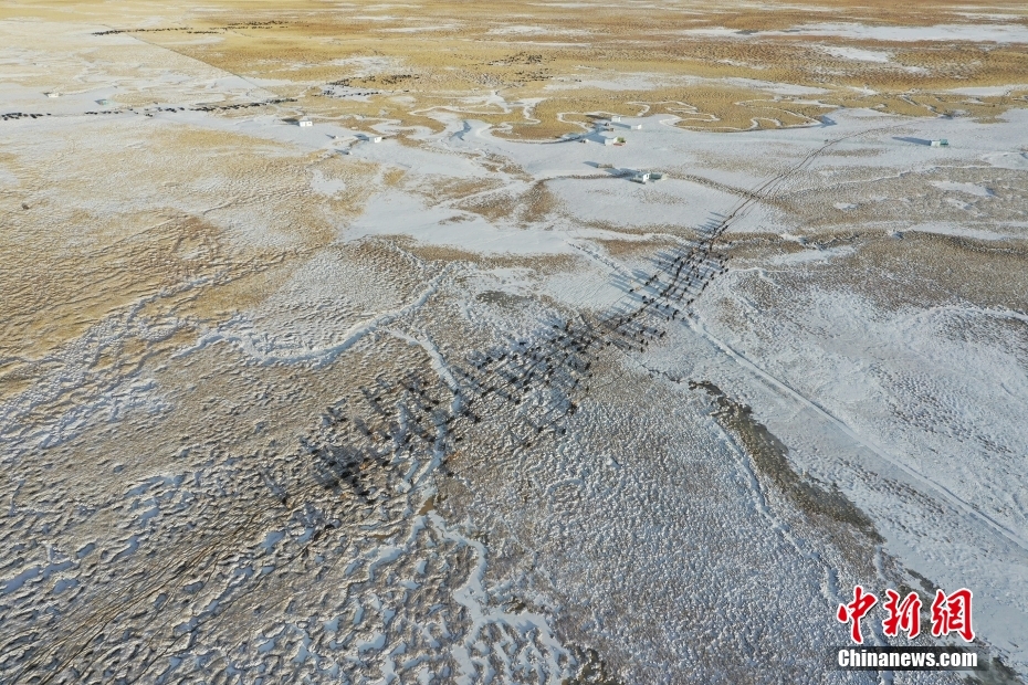 1月27日,當(dāng)雄縣龍仁鄉(xiāng)烏達(dá)村牧民趕著牛羊去牧場(chǎng)。當(dāng)雄縣位于西藏自治區(qū)拉薩市北部,距拉薩市區(qū)170公里?!爱?dāng)雄”,藏語意為“天選牧場(chǎng)”,平均海拔約4200米,草場(chǎng)廣闊,土地肥沃。(無人機(jī)照片) 中新社記者 貢嘎來松 攝