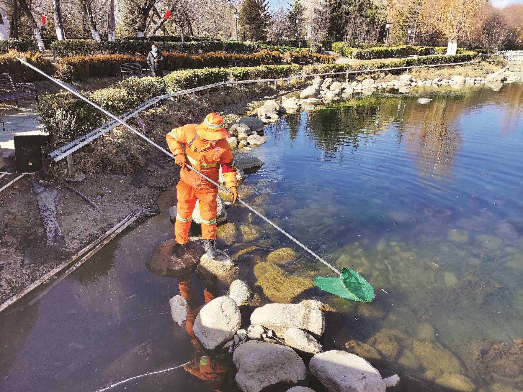 圖為布達(dá)拉宮廣場(chǎng)管理處工作人員手持長柄網(wǎng)兜打撈水里的垃圾。拉薩融媒記者 趙耀鐵攝