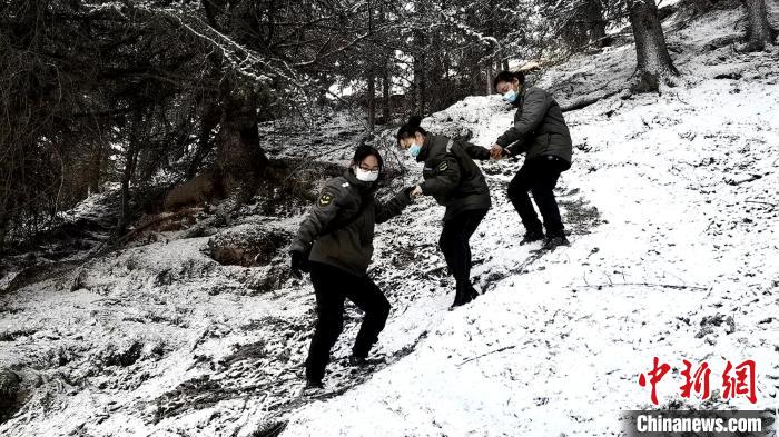圖為巡護(hù)途中相互扶持。 李雋 攝