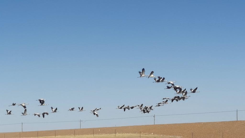 蓑羽鶴生性機警,記者所乘車輛在約百米遠處剛停下,成群的蓑羽鶴便展翅高飛,發(fā)出陣陣鳴叫,急急地向東北方向飛去。