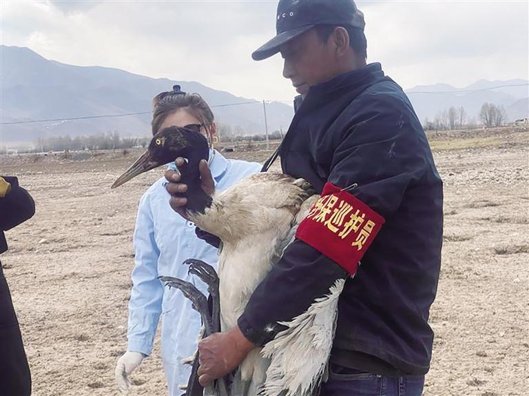 巡護(hù)員救助受傷黑頸鶴。文/圖 記者 王靜