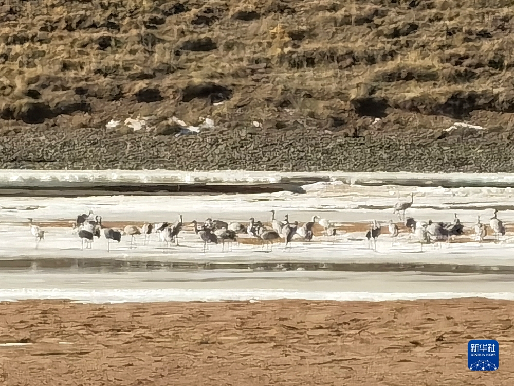 3月13日,在位于瑪多縣境內(nèi)的三江源國(guó)家公園黃河源園區(qū),記者拍攝到的一群蓑羽鶴在黃河干流河道間棲息覓食。新華社記者 呂雪莉 攝