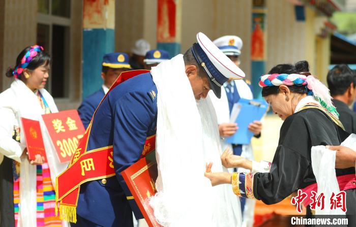 圖為村民為巴桑旺堆獻上哈達?!∥骼@拉翁 攝