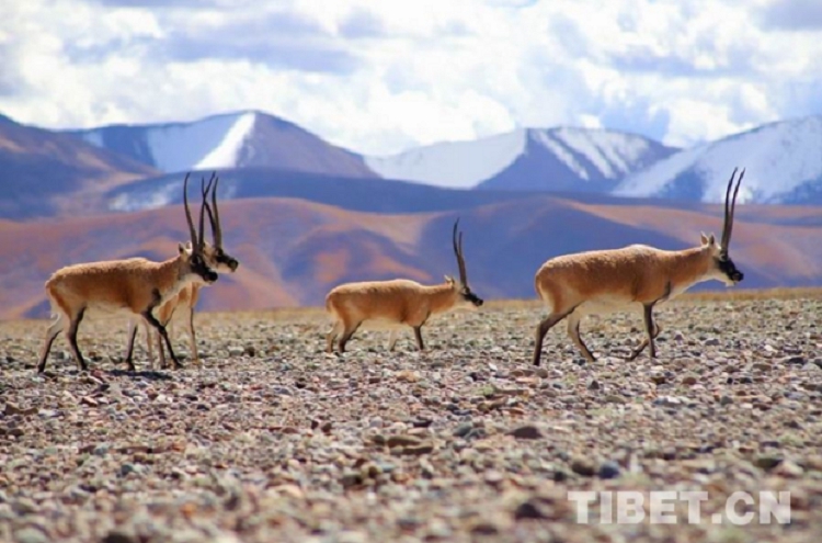圖為那曲市境內(nèi)雪山下正在遷徙的藏羚羊 攝影:王魯鎮(zhèn)