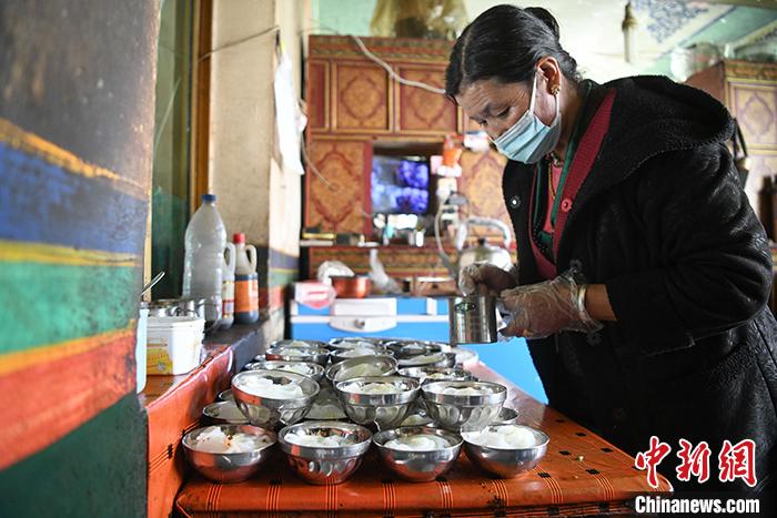 4月12日,拉薩市曲水縣色麥村村民普布卓嘎正在制作涼粉。 中新社記者 貢嘎來松 攝