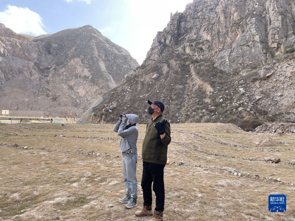 4月9日,在青海省海東市平安區(qū),王艦艇(右)觀察遠(yuǎn)處的黑鸛。 新華社記者 耿輝凰 攝