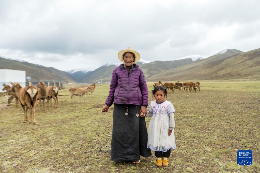向秋拉姆和孫女在類烏齊馬鹿國家級自然保護區(qū)內合影(5月21日攝)。新華社記者 周荻瀟 攝
