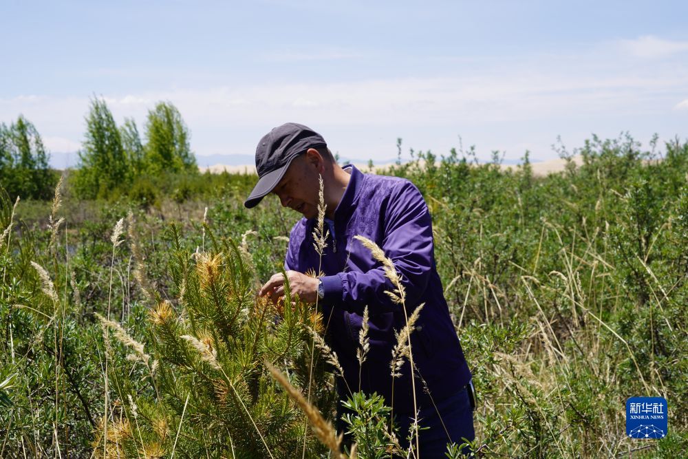6月16日拍攝的馬文虎在克圖治沙點(diǎn)查看綠植長(zhǎng)勢(shì)。新華社記者 李琳海 攝