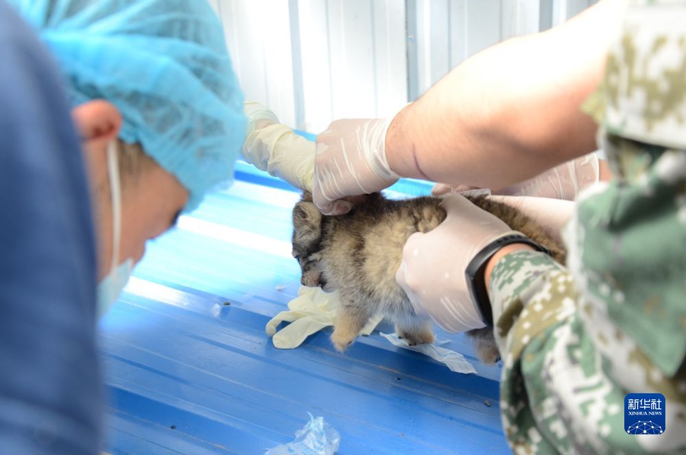 圖為2021年7月11日,工作人員在西寧野生動物園里為2個(gè)月大的小兔猻打疫苗。(西寧野生動物園供圖)