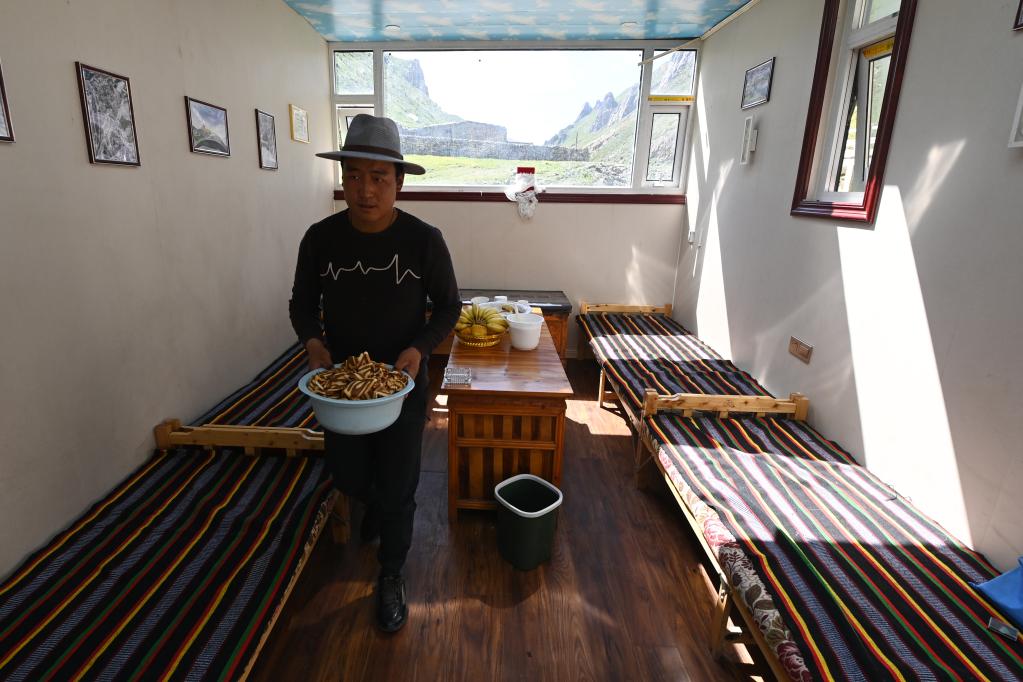 盛夏,昂賽大峽谷流水潺潺、綠草如茵;四周山勢奇絕,常有雪豹、白唇鹿、巖羊等野生動物出沒。在特許經(jīng)營接待集裝箱內(nèi),桑周忙著打掃衛(wèi)生,清洗床鋪,準備迎接從各地到來的自然體驗者。