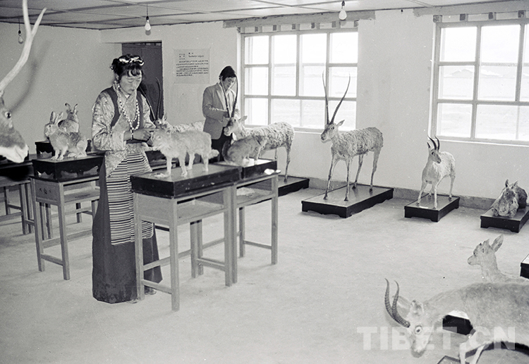 這是那曲地區(qū)(現(xiàn)那曲市)野生動物標(biāo)本館的工作人員正在整理所展示的野生動物標(biāo)本(唐召明1987年攝)