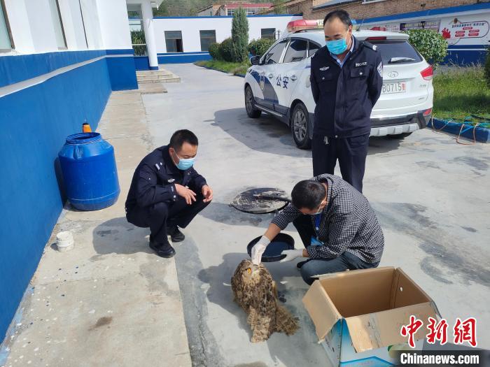 圖為互助縣野生動(dòng)物保護(hù)管理部門(mén)工作人員正在檢查國(guó)家二級(jí)保護(hù)野生動(dòng)物雕鸮受傷情況。 互助公安供圖