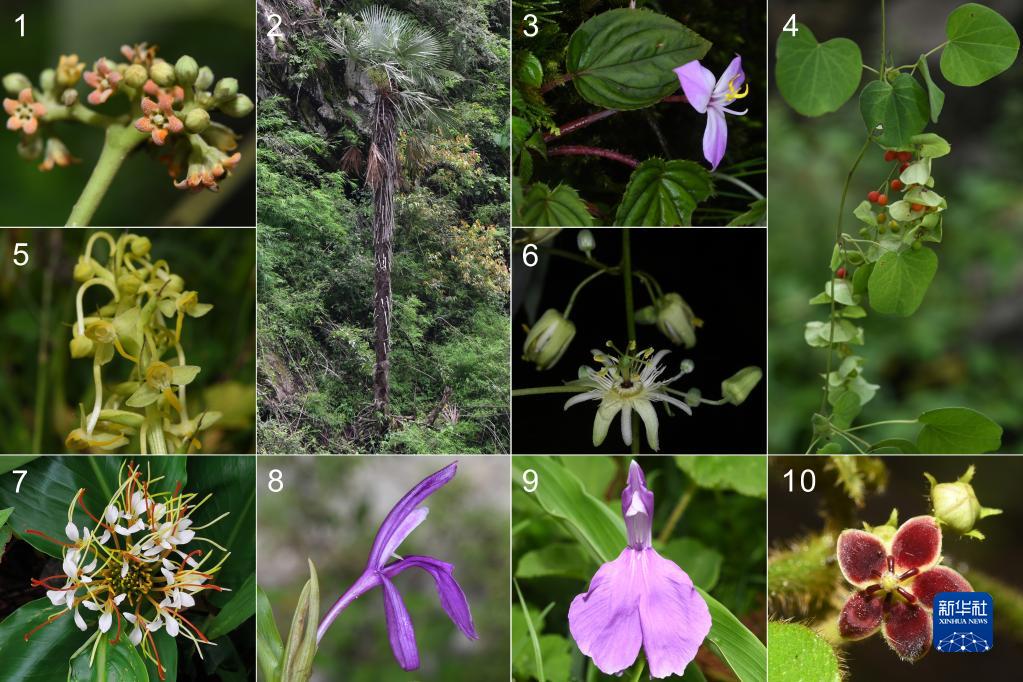 圖為:1、吉隆牛奶菜;2、塔基棕櫚;3、喀西蜂斗草;4、旋花錫生藤;5、吉隆角盤蘭;6、尼泊爾西番蓮;7、橢穗姜花;8、藏南象牙參;9、象牙參;10、箭藥藤(中國科學(xué)院西雙版納熱帶植物園供圖)