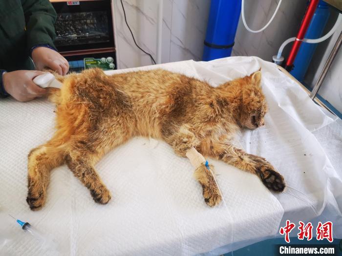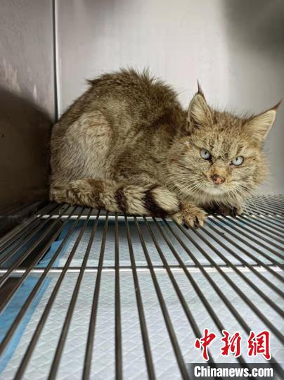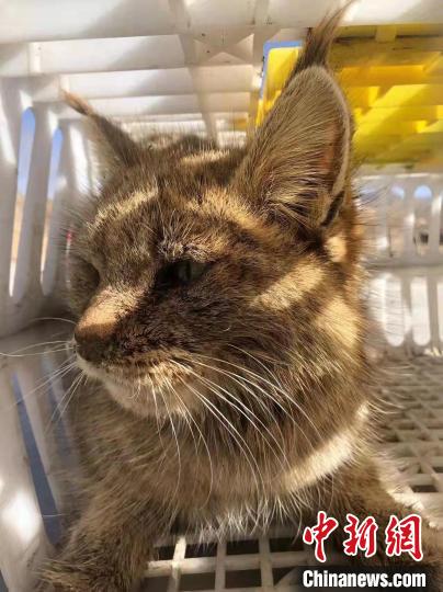 圖為被救護(hù)的荒漠貓“黃老太”?!∏嗪R吧鷦游锞茸o(hù)繁育中心供圖