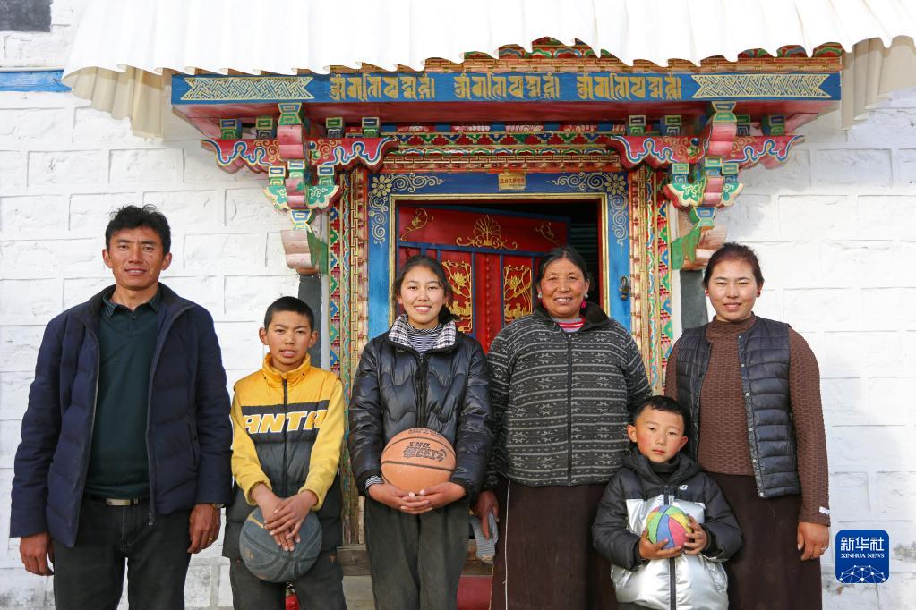 林芝市嘎拉村村民達(dá)瓦堅參(左一)一家在家門口合影(2022年2月23日攝)。新華社記者 姜帆 攝