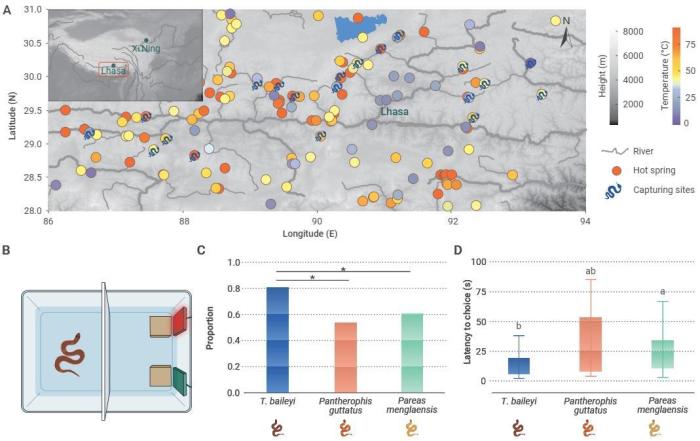 中國科研人員結(jié)合野外調(diào)查和文獻調(diào)研,整理了高原地熱資源以及溫泉蛇的分布信息,發(fā)現(xiàn)溫泉蛇高度偏好溫泉生境。通過趨熱行為學實驗證明,相較于另外兩種低海拔蛇類,溫泉蛇能夠更快速地定位到高溫區(qū)域,且對高溫區(qū)表現(xiàn)出強烈的偏好,提示溫泉蛇具有高效的溫度感知能力。