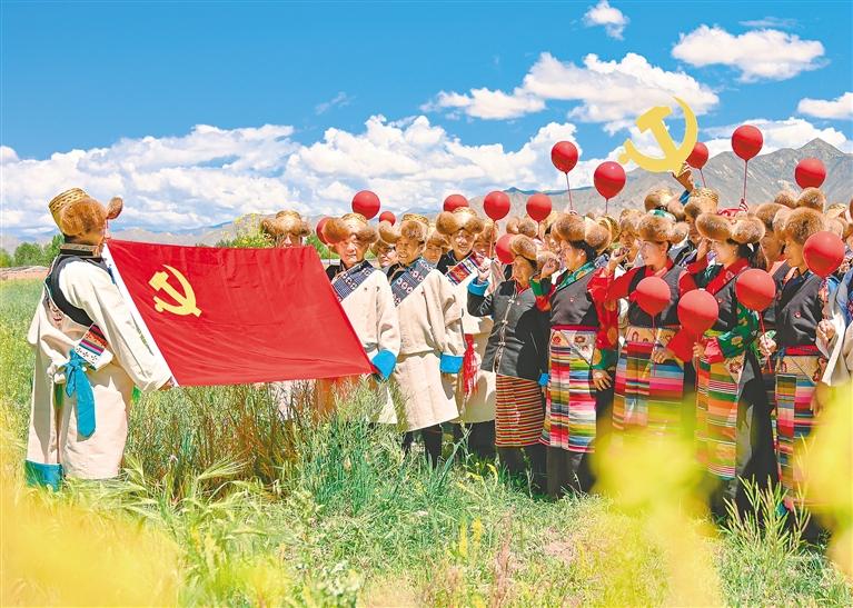圖為黨的光輝照邊疆、邊疆人民心向黨。各族群眾以淳樸而熱烈的形式表達(dá)自己的愛(ài)黨愛(ài)國(guó)情感。圖為2021年7月1日,西藏自治區(qū)貢嘎縣黨員開(kāi)展慶祝中國(guó)共產(chǎn)黨成立100周年“永遠(yuǎn)跟黨走”主題黨日活動(dòng)。