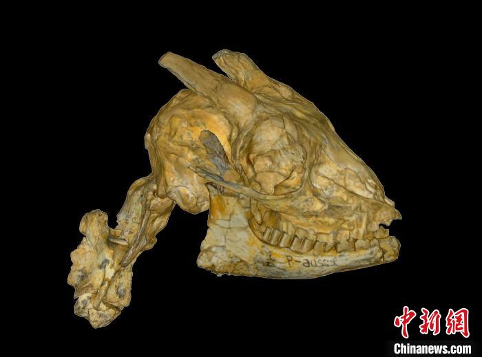 鄧氏臨夏羚的頭骨和頸椎化石標(biāo)本?!≈锌圃汗偶棺邓?供圖