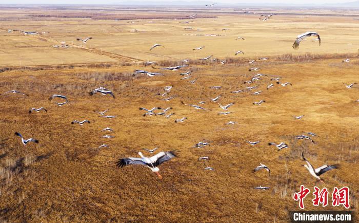 秋季集群的東方白鸛群。 黑龍江洪河國家級自然保護區(qū)管理局提供