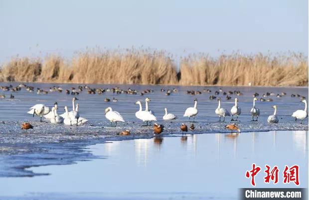 圖為大天鵝等越冬水鳥在湖邊覓食嬉戲?!∏嗪J×植菥止﹫D