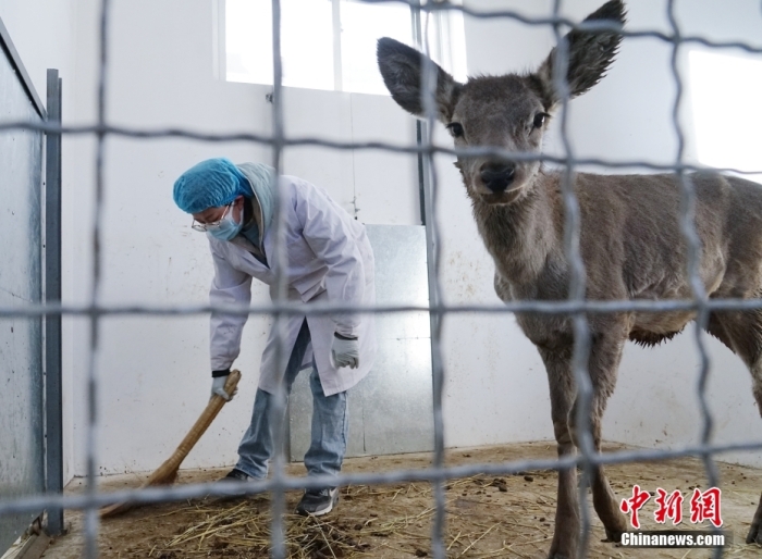 圖為1月18日,青海省祁連山國家公園野生動物救護(hù)繁育站工作人員徐豐奕正在打掃西藏馬鹿的籠舍。 中新社記者 馬銘言 攝