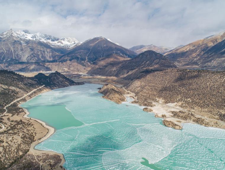 2月16日,西藏昌都,然烏湖半冰半水的湖面與雪山、藍(lán)天相互映襯,美如畫卷。(無人機(jī)照片)