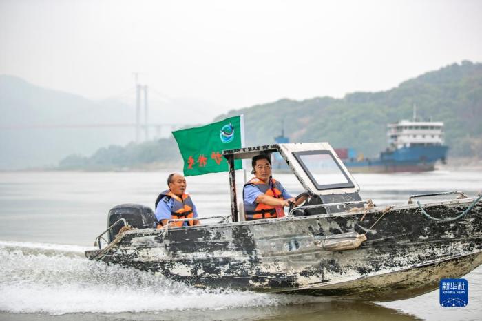 鴻鵠護(hù)魚志愿隊(duì)隊(duì)長(zhǎng)劉鴻(右)帶領(lǐng)隊(duì)員在長(zhǎng)江重慶江津段巡護(hù)(2022年9月2日攝)。新華社記者 黃偉 攝