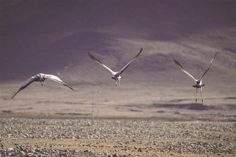 在西藏,黑頸鶴從越冬地到繁殖地有兩條線路:一條是拉薩到色林措,另一條則是從日喀則到色林措。整體來說,是從雅魯藏布江中游河谷黑頸鶴國家級(jí)自然保護(hù)區(qū)飛往色林措黑頸鶴保護(hù)區(qū),兩個(gè)保護(hù)區(qū)之間有一條固定的黑頸鶴遷徙路線,每年黑頸鶴會(huì)在3月中旬從越冬地雅江中游河谷及其支流拉薩河、年楚河流域的“一江兩河”地區(qū),飛去羌塘北部草原繁育后代;又會(huì)于11月中旬從繁殖地那曲的班戈縣、申扎縣、嘉黎縣,阿里的日土縣、普蘭縣,日喀則的昂仁縣,拉薩的當(dāng)雄縣返回到越冬地。對(duì)于雅江中游河谷來說,它是冬候鳥;對(duì)于羌塘北部草原來說,它是夏候鳥。
