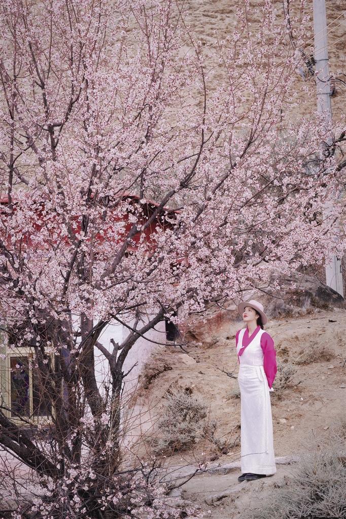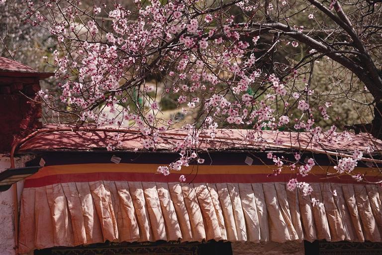 4月的帕邦喀,桃花開得正茂,桃樹枝上早已經(jīng)掛滿了大大小小的花朵,沿著石板臺階走走停停,可以看到桃樹舒展枝條,朵朵桃花爬上枝頭沐浴著春日的暖陽,在藍天白云、紅墻金頂?shù)挠骋r之下格外美麗,構(gòu)成一幅絕妙的春景詩畫。偶爾枝頭傳來清脆的鳥鳴聲,讓這里顯得愈發(fā)靜謐美好。