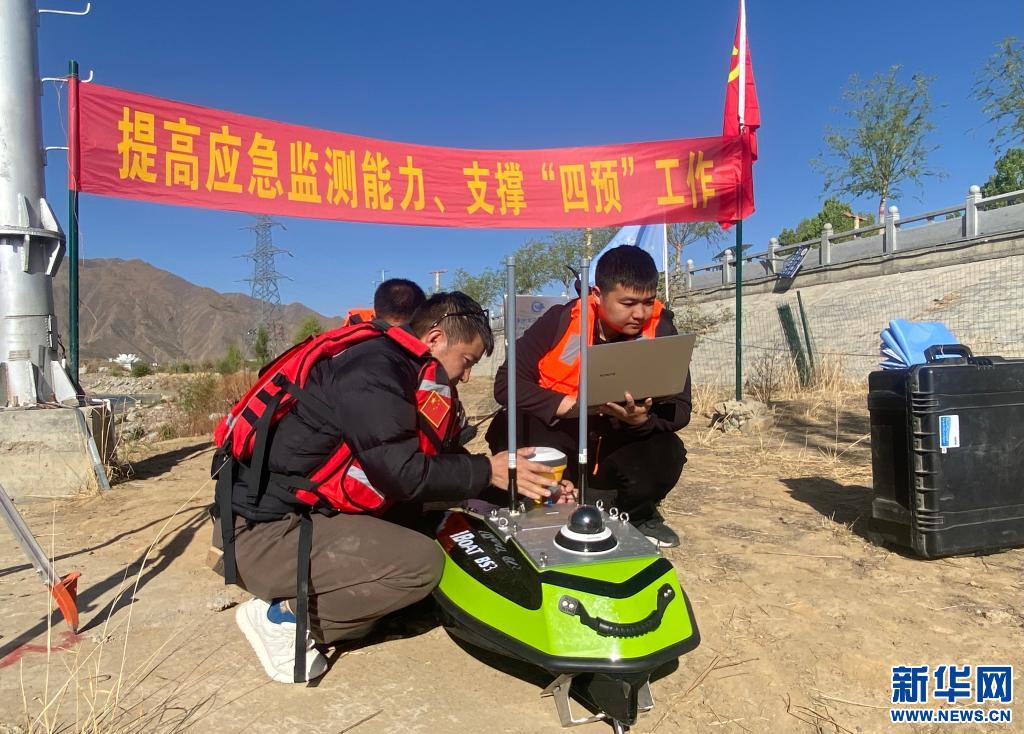 應(yīng)急演練現(xiàn)場,參訓(xùn)人員正在通過新技術(shù)監(jiān)測拉薩河水文信息。(4月27日 攝) 新華社記者 春拉 攝