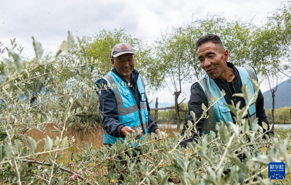 雅尼國(guó)家濕地公園管護(hù)員普布多杰(右)和同事在巡護(hù)途中查看樹木長(zhǎng)勢(shì)(9月8日攝)。新華社發(fā)(丁增尼達(dá) 攝)