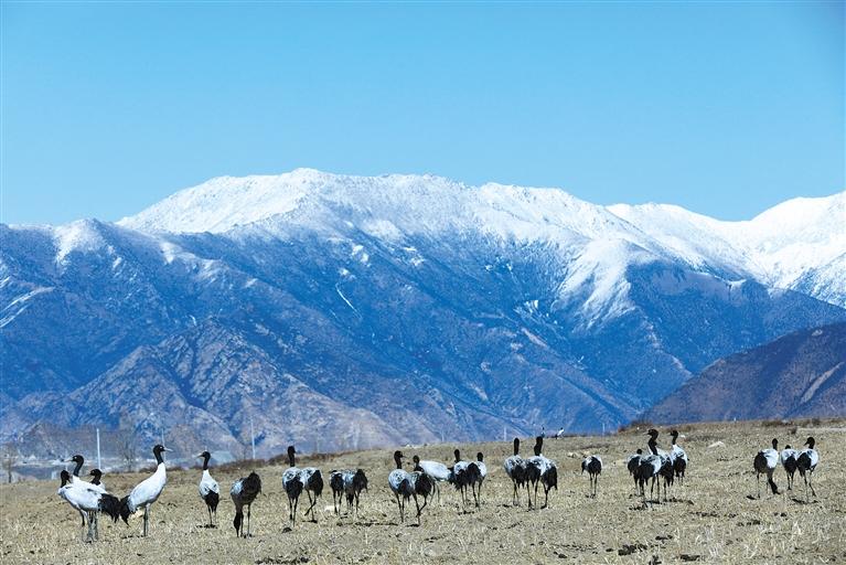 國家一級保護(hù)動(dòng)物黑頸鶴在墨竹工卡縣境內(nèi)的農(nóng)田里覓食。
