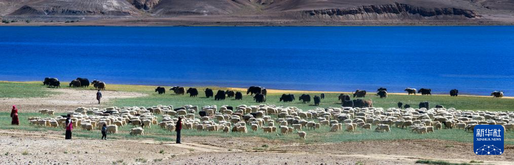 牧民在班公湖畔放牧(無人機(jī)照片,9月21日攝)。新華社記者 姜帆 攝