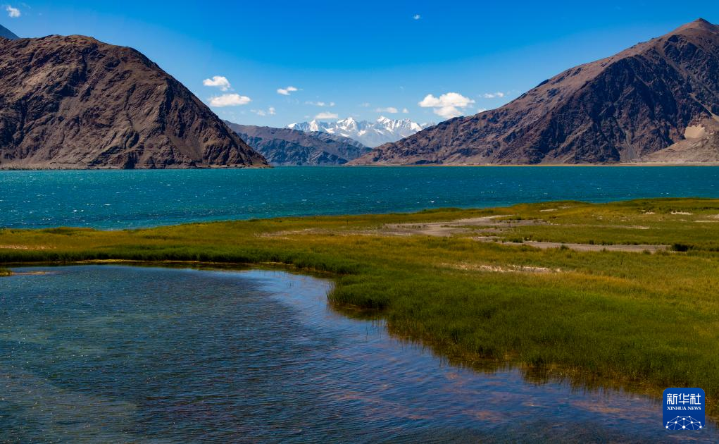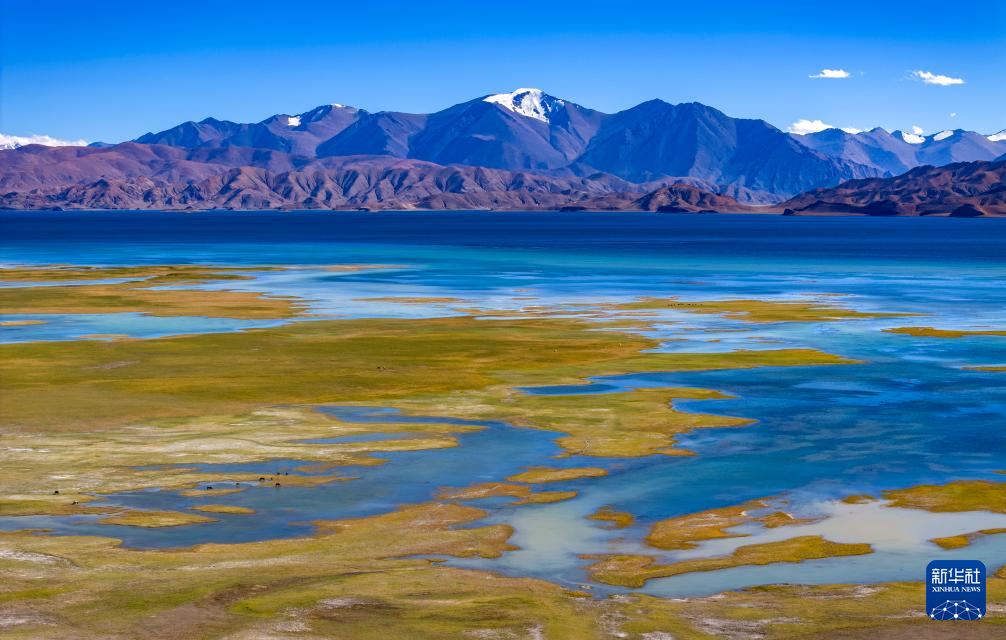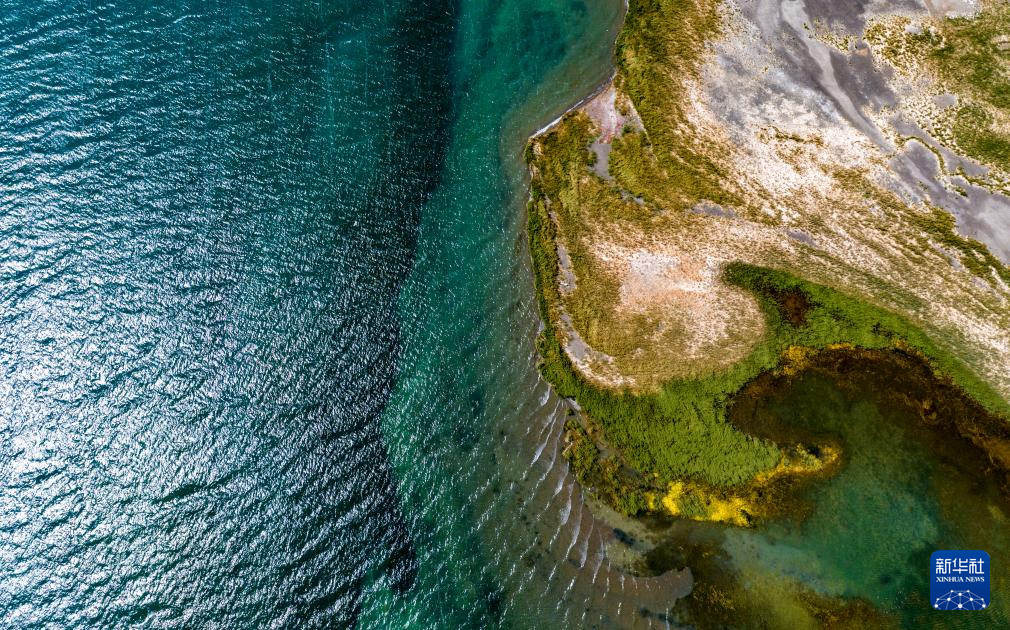 鳥瞰班公湖畔的濕地(無人機(jī)照片,9月21日攝)。新華社記者 姜帆 攝