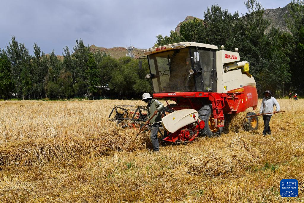 工作人員駕駛農(nóng)業(yè)機(jī)械在西藏拉薩市林周縣曲果強(qiáng)村的高標(biāo)準(zhǔn)農(nóng)田里收獲小麥(10月12日攝)。新華社記者 張汝鋒 攝