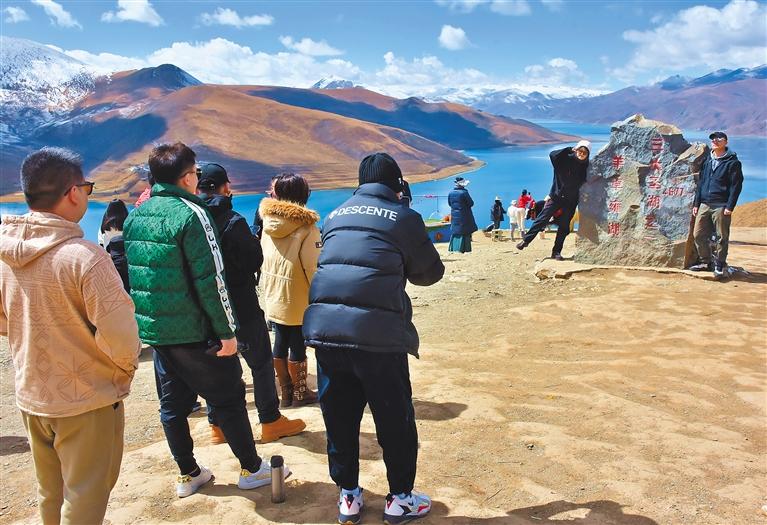 圖為游客在浪卡子縣羊卓雍措觀景臺(tái)拍照留念。記者 劉楓 攝
