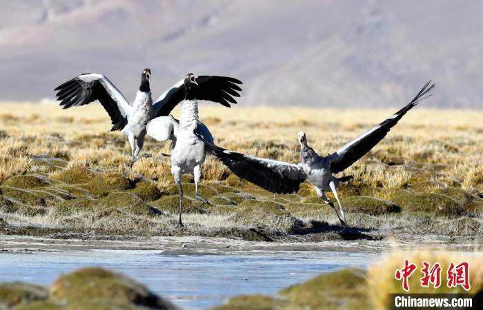 10月21日,黑頸鶴在西藏那曲市申扎縣買巴鄉(xiāng)附近的濕地“翩翩起舞”。 李林 攝