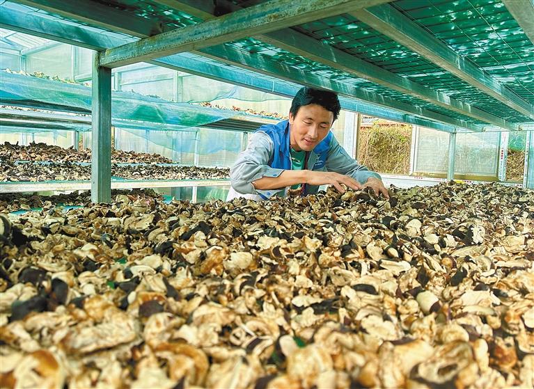 圖為林芝市墨脫縣格當(dāng)鄉(xiāng)尼日卡合作社的管護(hù)人員在翻看晾曬的新鮮靈芝。郎玲 記者 王敏 攝