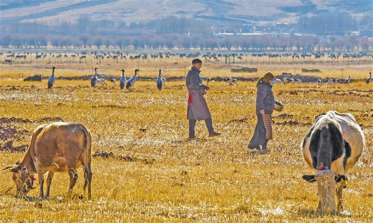 卡孜濕地是其中一個(gè)投食點(diǎn)?,F(xiàn)年43歲的洛桑次旦就住在附近,每天一大早,他都會到卡孜濕地放牧?!啊従印絹碓蕉嗔?,十幾年的時(shí)間,黑頸鶴的數(shù)量從幾只增長到幾百只?!甭迳4蔚└嬖V記者,黑頸鶴和牛各吃各的,互不干擾,非常和諧。