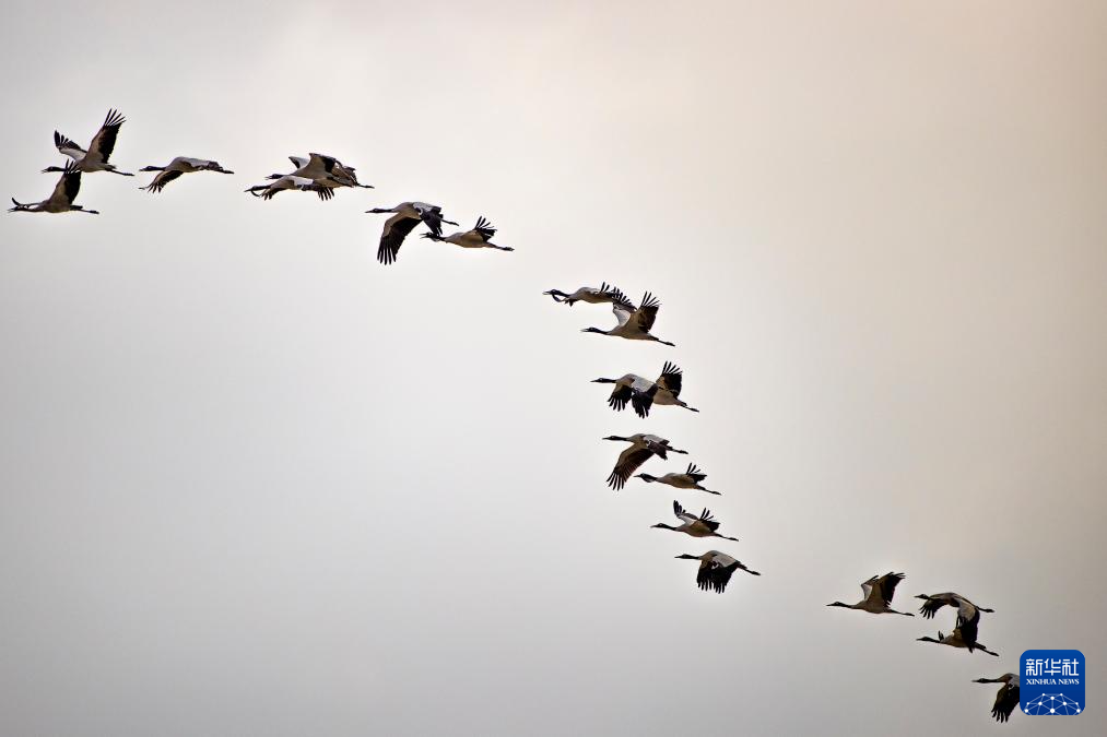 這是12月5日清晨在拉薩市林周縣虎頭山水庫拍攝的越冬黑頸鶴。新華社記者 曹檳 攝