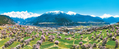 桃花盛開季節(jié)的索松村與遠(yuǎn)處白雪皚皚的南迦巴瓦峰交織成一幅壯美的畫卷。馬春林 攝