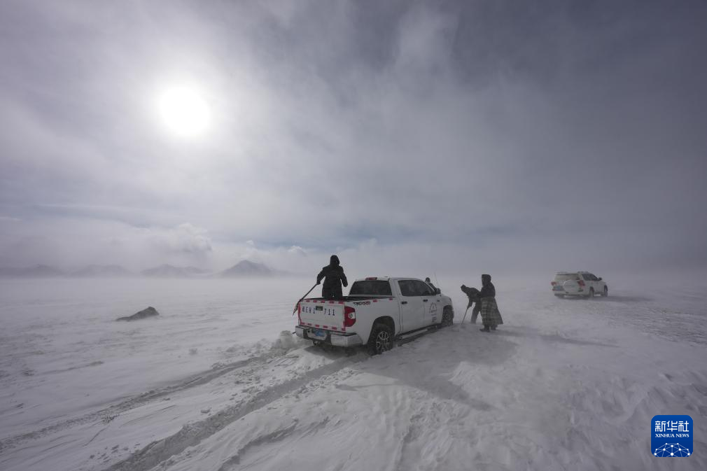 瑪曲鄉(xiāng)長江源黨員環(huán)保志愿隊巡邏途中車輛陷入雪中后進(jìn)行自救(2024年2月2日攝)。新華社記者 晉美多吉 攝