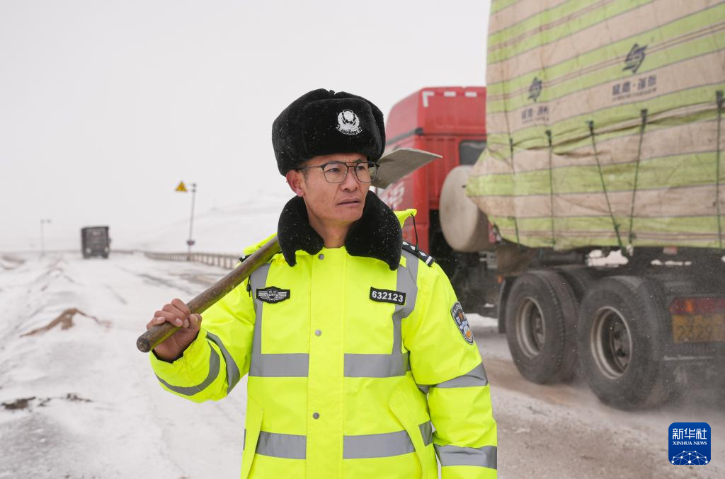 安多交警大隊秩序中隊隊長達(dá)娃云旦在冰雪路段緊盯過往車輛(2024年2月1日攝)。新華社記者 晉美多吉 攝