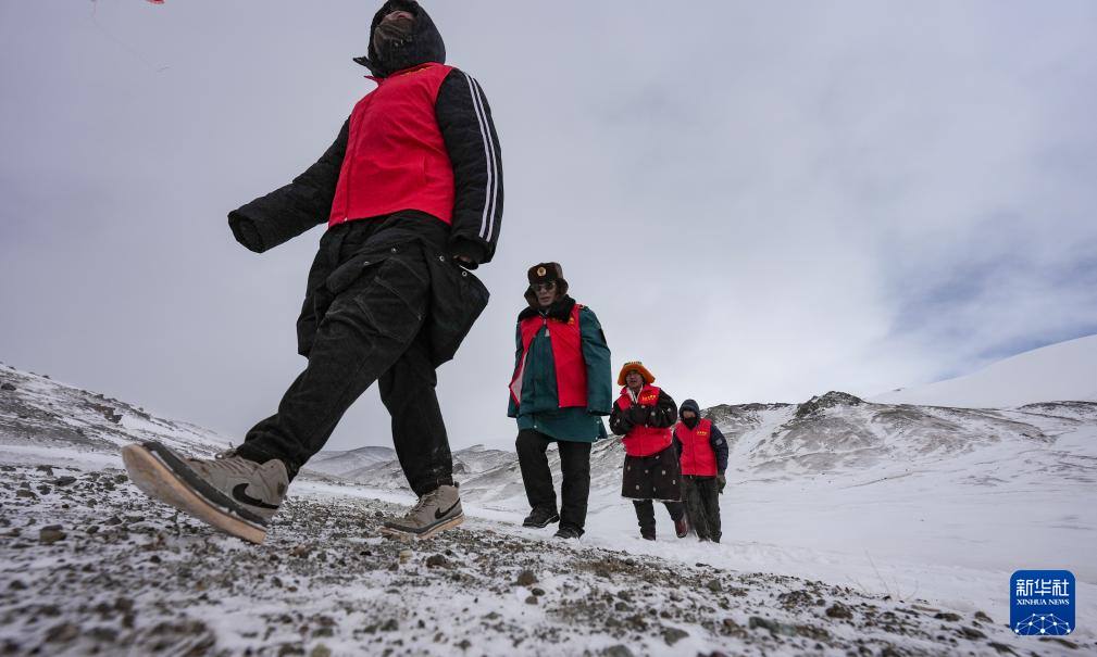 瑪曲鄉(xiāng)長江源黨員環(huán)保志愿隊年近七旬的才嘎老人(左二)在巡邏守護(hù)長江源(2024年2月2日攝)。新華社記者 晉美多吉 攝