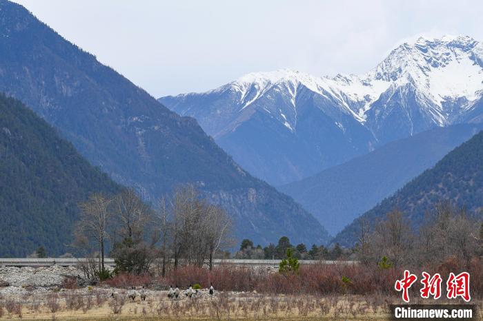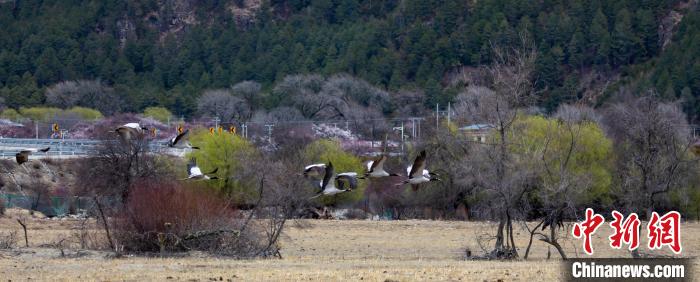 西藏林芝:黑頸鶴與雪山桃花共繪生態(tài)畫卷
