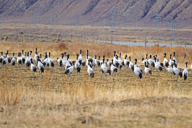 黑頸鶴在墨竹工卡縣唐加鄉(xiāng)拉東村農(nóng)田里棲息。