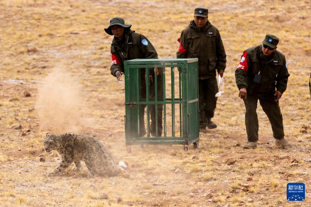 5月7日,尼瑪縣野生動物管護(hù)隊(duì)工作人員在羌塘國家級自然保護(hù)區(qū)核心區(qū)將雪豹放歸自然。新華社記者 姜帆 攝??