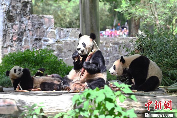 4月21日,中國(guó)大熊貓保護(hù)研究中心都江堰基地的大熊貓享用美食,憨態(tài)可掬。中新社記者 安源 攝