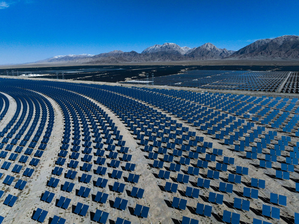 345平方公里的發(fā)電園內(nèi),超過1000萬塊光伏板高低起伏連成蔚藍色的“海洋”,年發(fā)電量超過200億千瓦時,相當(dāng)于減排二氧化碳超過2122萬噸。